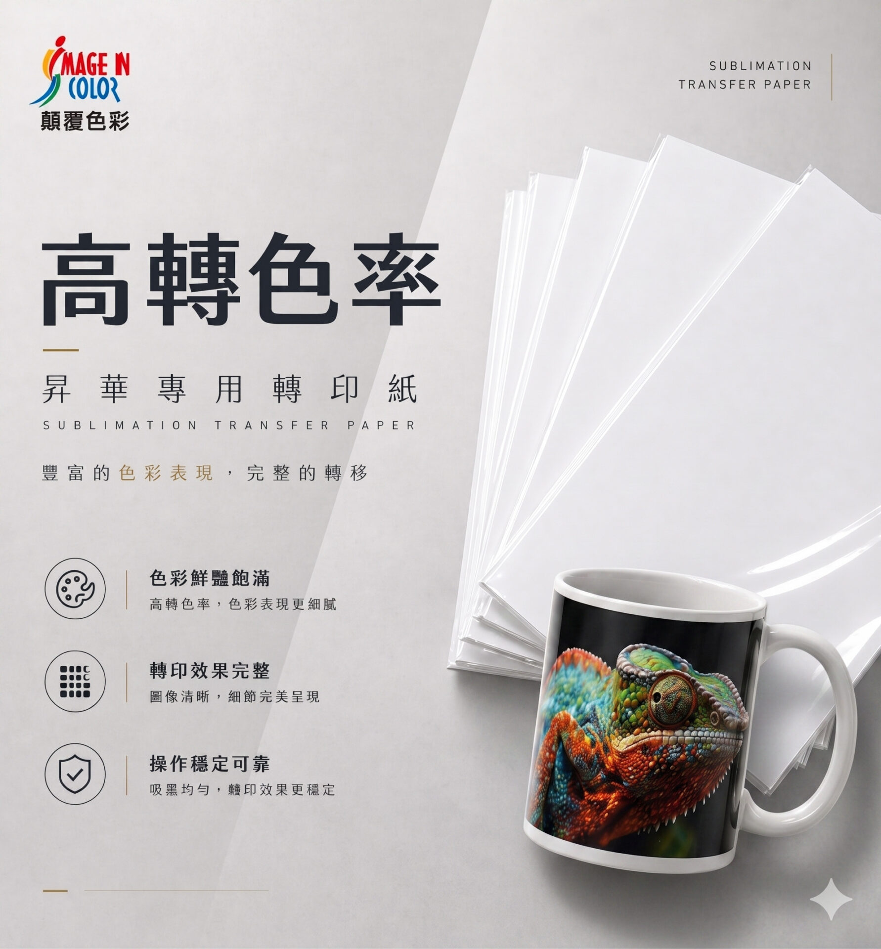 為日本大廠製造生產,適用於大型昇華輸出機使用,採用專業的塗布技術,大幅提升移色率使轉印後的顏色更加鮮豔。